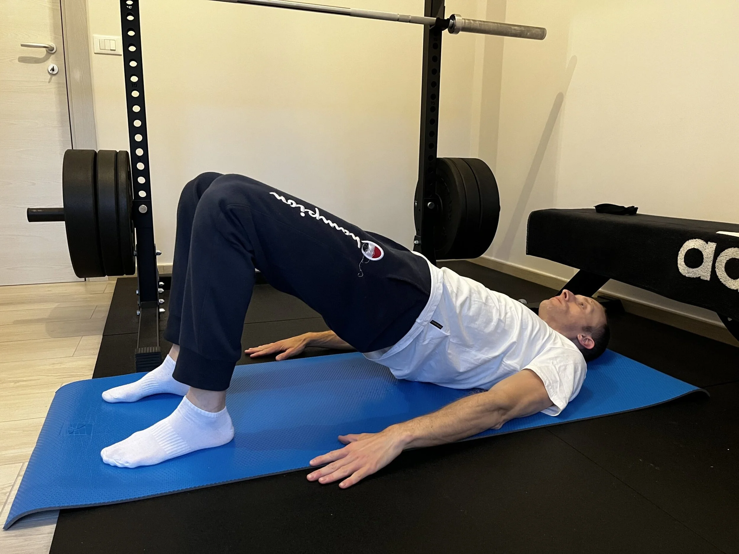 Sdraiato a pancia in su, con le ginocchia piegate, solleva il bacino. Stai in posizione qualche secondo e poi ritorna alla posizione iniziale.